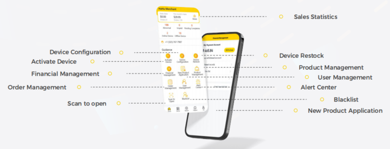 An app can help manage vending business. The system contains a variety of functions such as remote control devices, data statistics, replenishment orders management, and consumer complaint handling. The app displays inventory count, sales count, and auto-generates restocking orders. Easy restocking!