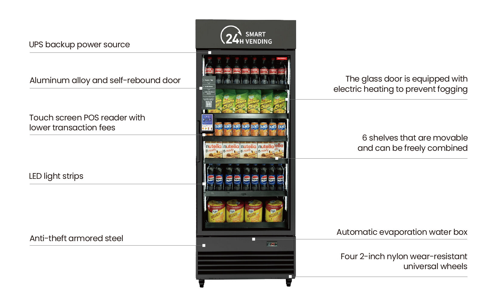 The structure is simple, rarely needs maintenance, and items will never get stuck. Vending machines with card readers make shopping more convenient and can flexibly reprice and set promotions.